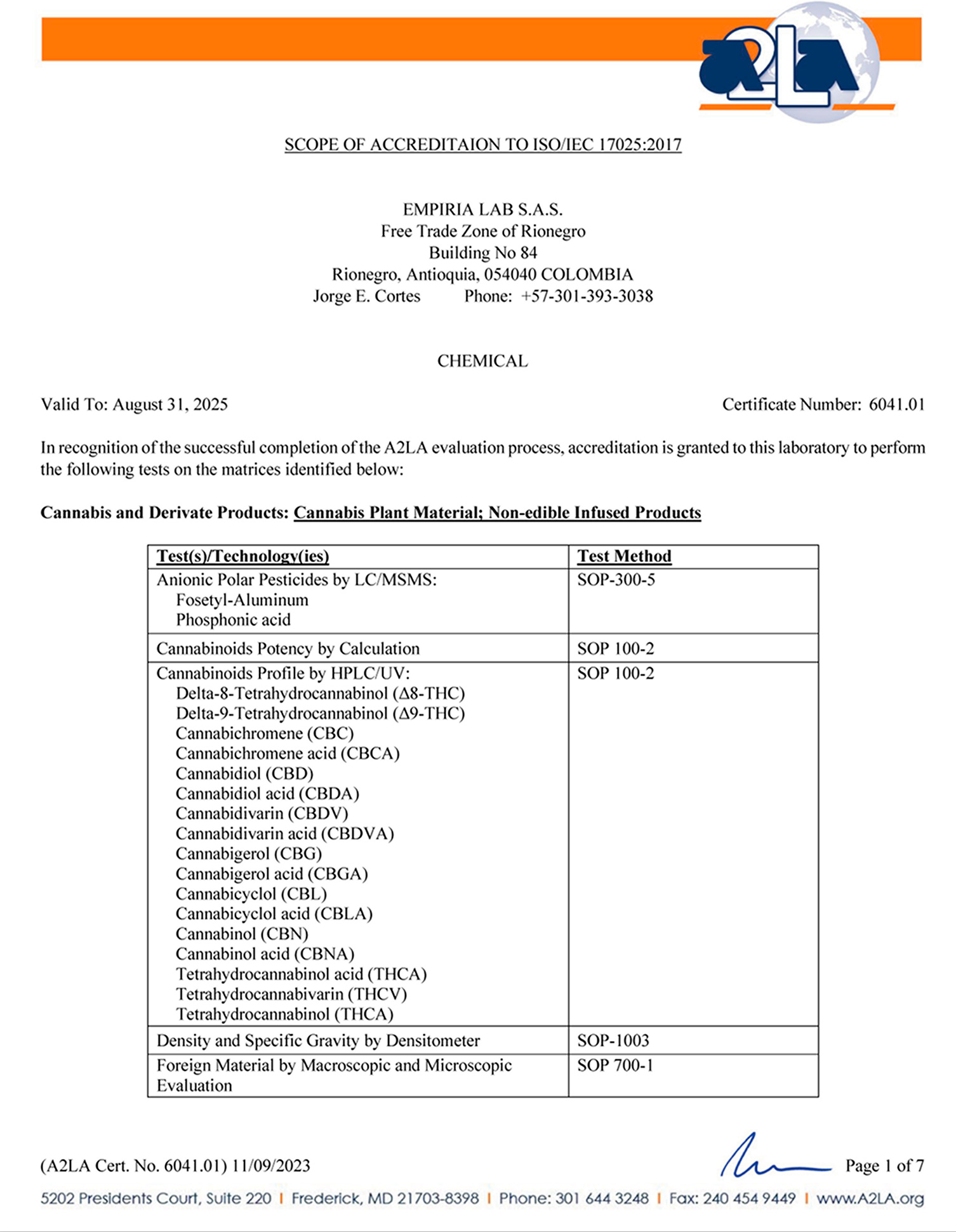 Scope of A2LA certification